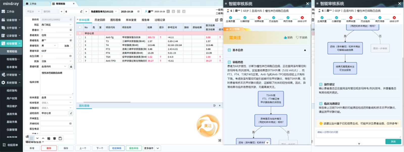 如针对一位患者 TSH 升高的情况,检验大模型迅速展示其患有“慢性淋巴白血病”,并综合其“桥本氏甲状腺炎”病史和历史用药,给出“无需高度关注”的建议,并建议与临床沟通是否有药物影响,并进一步监测甲状腺功能。