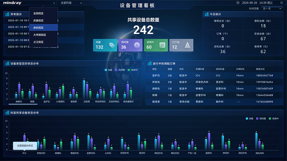 全院设备被纳入统一资源池,医护人员在移动端随时调用,系统自动推荐最近可用设备并规划取用路径,使用完毕自动计时结算,资源状态即时释放。