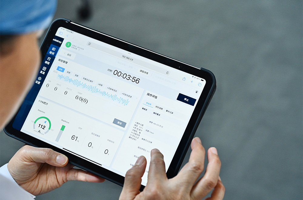 在面向专业急救人员进行生命支持急救培训场景时,广州市急救医疗指挥中心采用迈瑞最新开发的急救培训考核系统,其培训课程和考核方案为大赛医疗保障量身定制,涉及的急救病例基于真实数据整合。在培训和考核过程中,可实时可视化反馈学员心肺复苏按压的质量,并且可以进行定量的考核评分,大幅提升学员急救培训效率和质量,同时提升了考核的客观性。