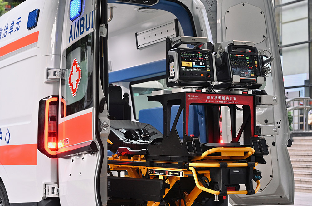 车内急救设备包括融合体征监护、心脏除颤、超声筛查、12 导心电图等功能于一体的 BeneHeart DX 除颤监护仪、TV80 转运呼吸机、n 系列输注泵等,为院前重症患者救治提供强有力的技术支撑。