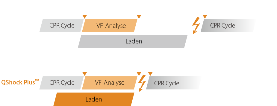 Mit QShock™ Plus erfolgt die Voraufladung synchron zur HLW, während gleichzeitig ausreichend Energie gespeichert wird, um den AED einsatzbereit zu halten. Nach jedem HLW-Zyklus kann ein Schock in nur 5 Sekunden abgegeben werden.