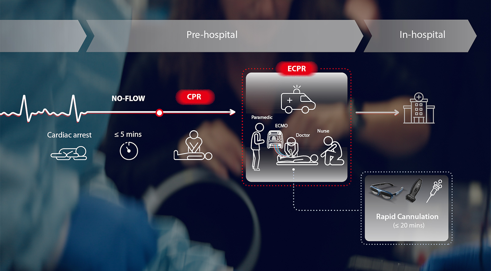 This is not just an ambulance. It's a fully-equipped mobile ICU staffed with a doctor, nurse, and paramedic specially trained in ECPR deployment. Within the critical golden hour, they assess the brain and establish ECPR circulation, then stabilize the patient for transport.