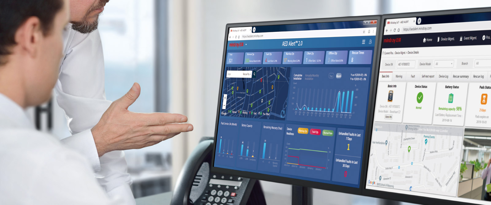 It provides comprehensive device remote management including the status of devices and consumables, rescue data, and self-test results - thereby reducing maintenance costs. The system also offers holistic oversight, displaying device locations and installation trends.