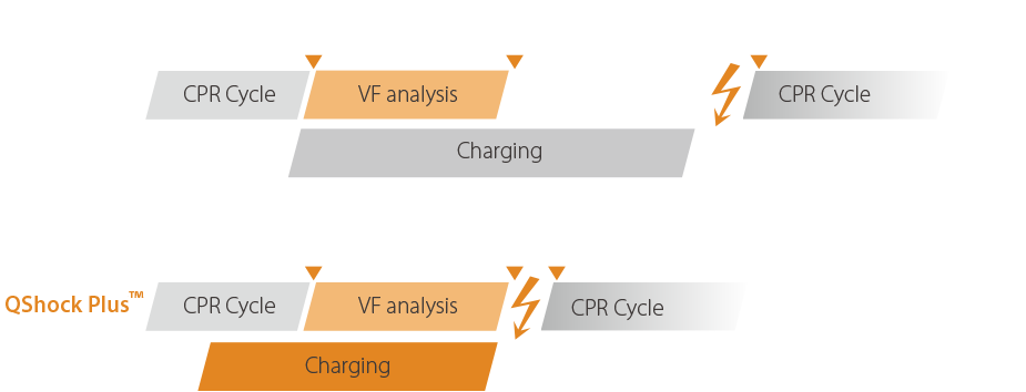 QShock™ Plus not only performs synchronous pre-charging during CPR but also maintains sufficient energy to keep the AED ready. After every CPR cycle, a shock can be delivered in as little as 5 seconds.