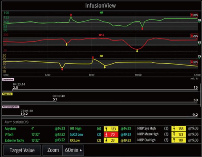 The DPS (Dynamic Pressure System) that monitors the pressure with numeric and graphic illustration helps caregivers identify occlusion in advance to prevent potential risks.