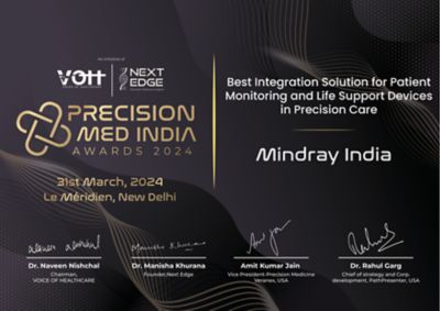 Mindray India, one of the leading providers of medical devices and solutions, has been honoured with the esteemed "Best Integration Solution for Patient Monitoring & Life Support Devices in Precision Care" award at the recent PRECISION MED INDIA AWARDS 2024 organized by Voice of Healthcare at Le Meridien, New Delhi on 31 March 2024.
