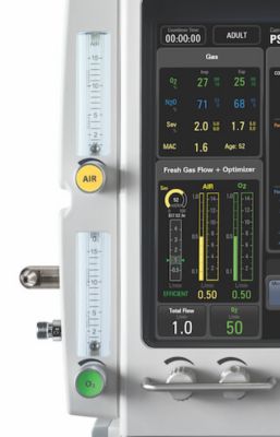 Within a breathing system, vaporizers help to add precise amounts of anesthetics to the gas flow. In most machines, the total gas flow enters the vaporizer, which splits the fresh gas into a carrier gas and a bypass gas. The carrier gas receives the anesthetic agent and then meets back up with the bypass gas before entering into the patient’s breathing circuit. Operators can control the ratio of the split to decrease or increase the gas concentration, thus controlling the amount of anesthetic a patient will receive.