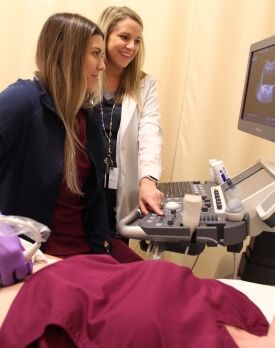 Kelly: We combine clinicals and classes throughout the five semesters of the program. As first-year students, they learn physics in order to take their SPI registry, normal anatomy of the abdomen, small parts, and obstetrics and gynecology. As second year students, they focus more on vascular and dive into the pathology of the abdomen.
