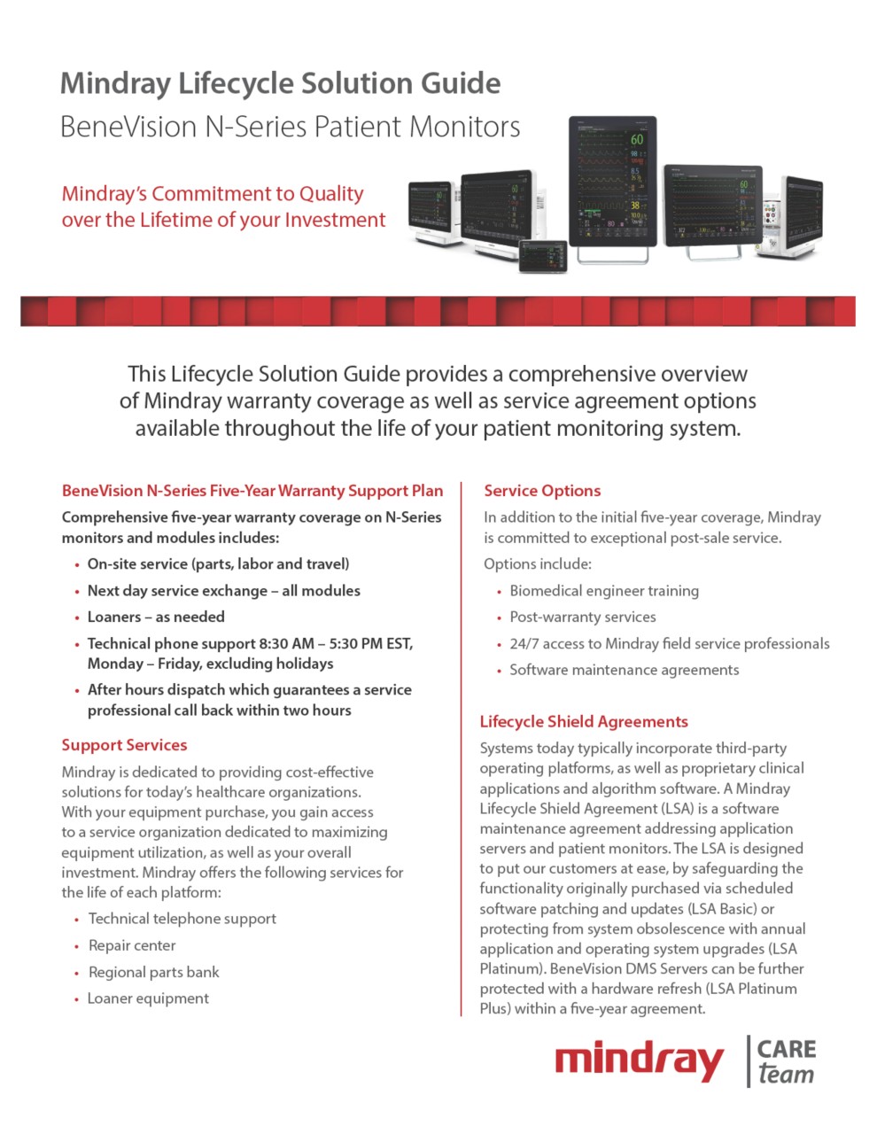 When you invest in Mindray solutions, you gain access to the Mindray CARE Team - a service organization dedicated solely to ensuring you get the most use out of your equipment, so you can ensure your patients get the most out of their care. Our dedicated feld service team and in-house technical support organization represent one of the largest direct service teams in the industry.