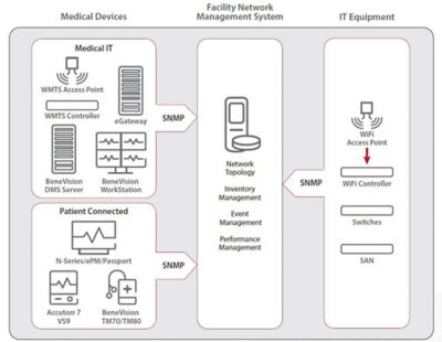 Medical devices and IT equipped with SNMP communication provide notificationsto a facilities SNMP compatible Network Management System (NMS)