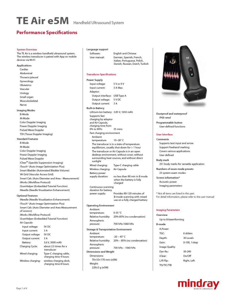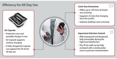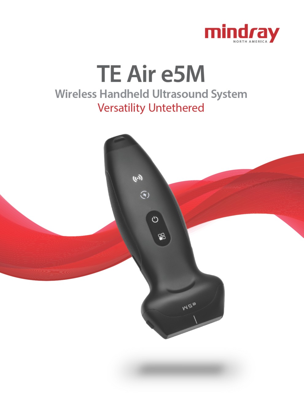 Though the TE Air e5m appears to have a linear footprint, depending on the preset you choose, this handheld is powered by Mindray’s Matrix Thin Slice technology, which provides broader frequency bandwidth compared to traditional transducers. The transducer will switch between linear and convex settings to scan head to toe without the need to switch transducers.