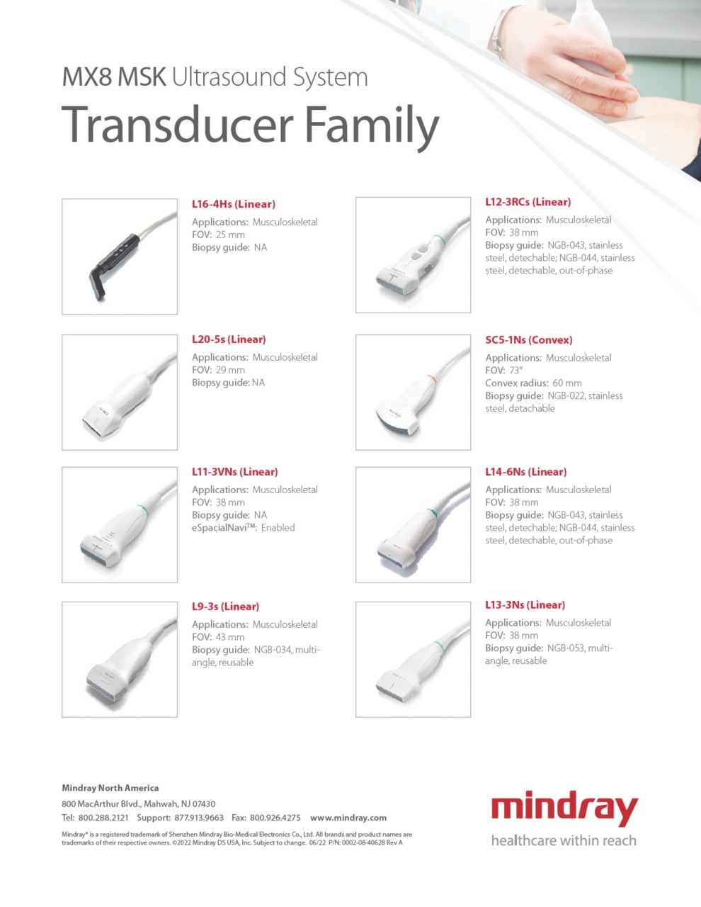 The MX8 MSK Ultrasound System offers a comprehensive portfolio of transducers for both superficial and deep tissue imaging ranging from 5-1MHz low frequency transducer to 20-5MHz ultra-high frequency transducers. The L12-3RCs linear transducer offers three programmable buttons, making it an excellent solution for MSK applications.