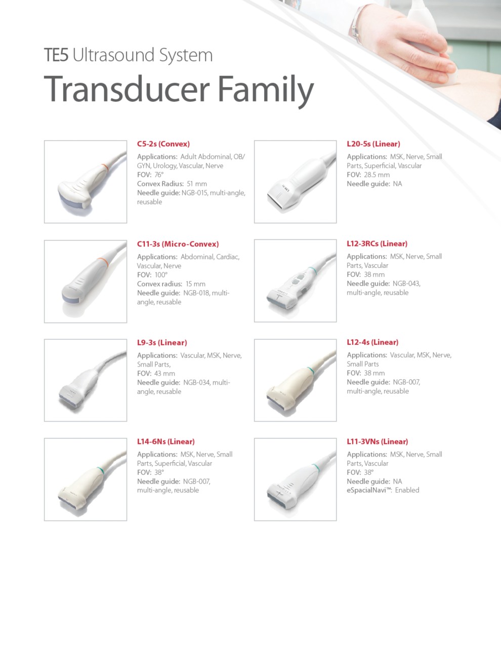 With a slim profile and small footprint cart, the TE5 System is easy to transport from room to room for effortless scanning at the patient’s bedside. In addition, flexible mounting options for the wall or tabletop are available. Given the importance of infection control, the TE5 System’s seamless touch screen and auto-lock feature prevent residue buildup and make it easy to clean and disinfect even during exams.