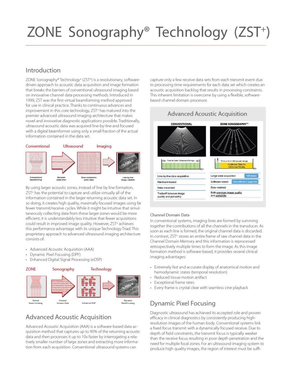 produce high quality images, the region of interest must be sufficiently sampled in both the axial and lateral dimensions to prevent several types of imaging artifacts. Dynamic Pixel Focusing permits utilization of the complete channel data set received from multiple, overlapping zones to retrospectively improve the position and focus of each individual data point. Using software algorithms to synthetically focus along every point in the receive beam effectively produces a round-trip beam focused at all depths, eliminating the need for multiple transmit foci. The image is 2-way focused at every point. A typical ZST+ ultrasound image has over 500 range samples, so the net effect is equivalent to a conventional beamformer-based system using 500-600 focal zones.