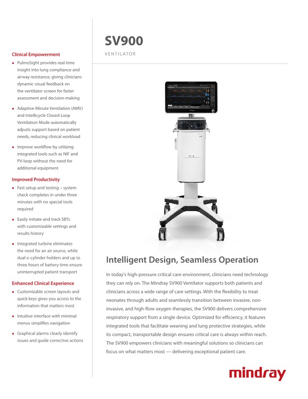 The SV900 ventilator is a fully configured system meeting the advanced clinical needs of high-acuity ICUs. Built for adaptability, flexibility, and efficiency, the SV900 supports patients of all ages and respiratory needs across diverse care settings.