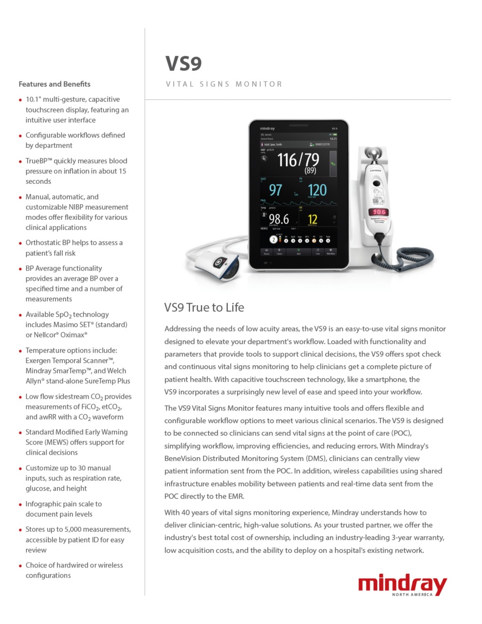 With 40 years of vital signs monitoring experience, Mindray understands how to deliver clinician-centric, cost-effective solutions that withstand the rigorous hospital environment. The VS9, manufactured using disinfectant-resistant polymers, coupled with industry-leading warranties, and supported by outstanding technical and clinical resources, provides best-in-class total cost of ownership. Simple and smart connectivity solutions are available with no recurring connectivity licensing fees, making seamless integration a true possibility, no matter your facility size nor budget. In addition, Mindray’s complete line of high-performance, quality supplies, and accessories means Mindray is fully-equipped to be your true partner in creating a higher standard for healthcare.