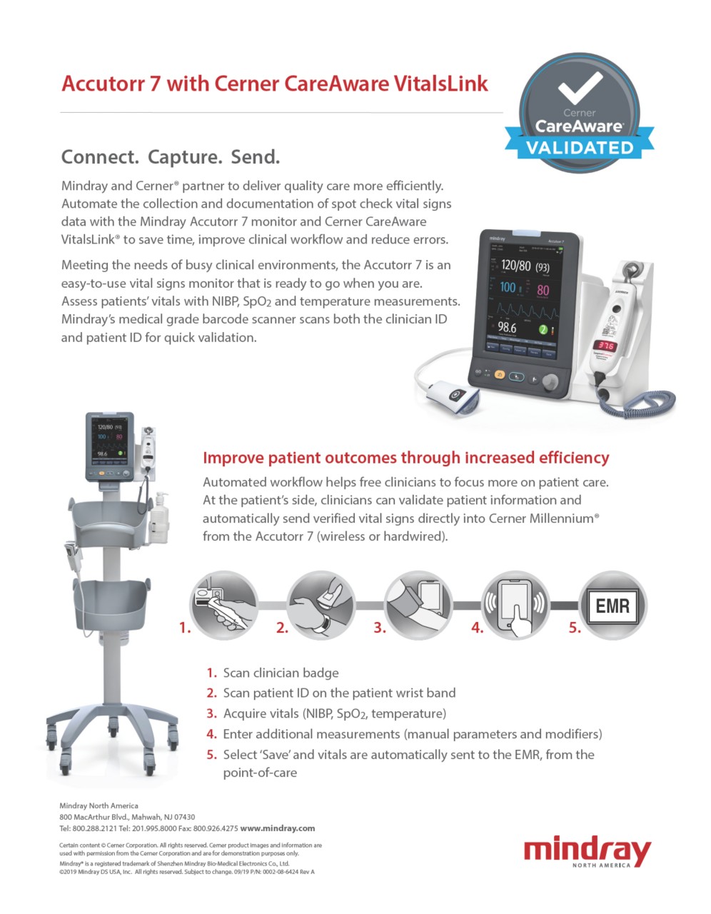 Mindray’s partnership with EMR solution providers enables a streamlined process for integrating the VS9 Vital Signs Monitor with your hospital’s EMR, all with no recurring licensing fees. The VS9 integrates with the Cerner® CareAware VitalsLink® platform to automate the collection and documentation of spot check vital signs data to save time, improve clinical workflow and reduce errors.