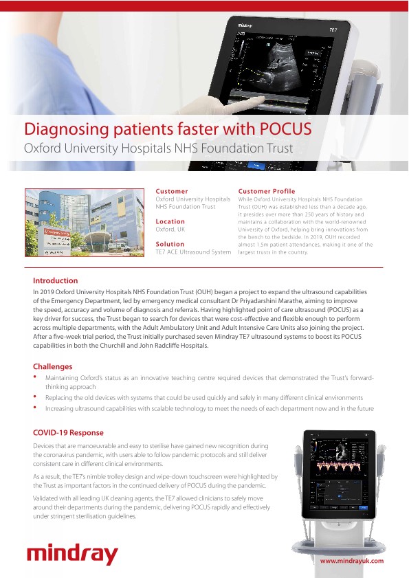 In 2019 Oxford University Hospitals NHS Foundation Trust (OUH) began a project to expand the ultrasound capabilities of the Emergency Department, led by emergency medical consultant Dr Priyadarshini Marathe, aiming to improve the speed, accuracy and volume of diagnosis and referrals. Having highlighted point of care ultrasound (POCUS) as a key driver for success, the Trust began to search for devices that were cost-effective and flexible enough to perform across multiple departments, with the Adult Ambulatory Unit and Adult Intensive Care Units also joining the project. After a five-week trial period, the Trust initially purchased seven Mindray TE7 ultrasound systems to boost its POCUS capabilities in both the Churchill and John Radcliffe Hospitals.